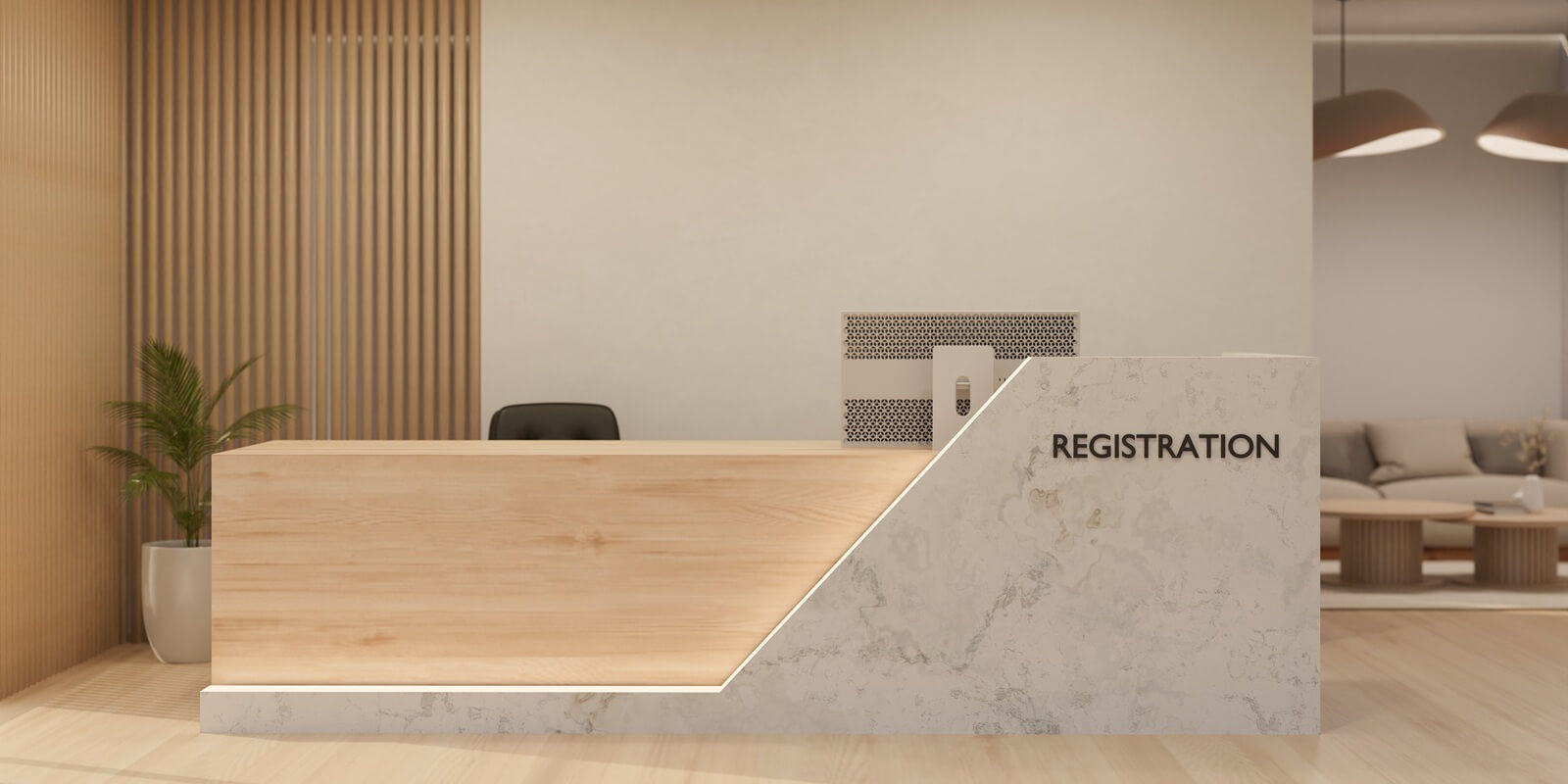 modern, luxury, and beautiful registration counter or lobby front desk area interior design