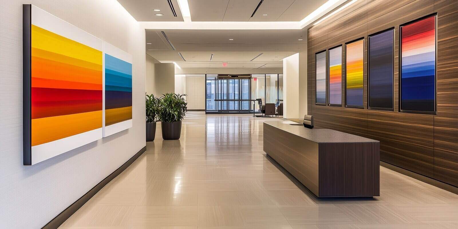 modern office lobby featuring vibrant abstract art and a reception desk